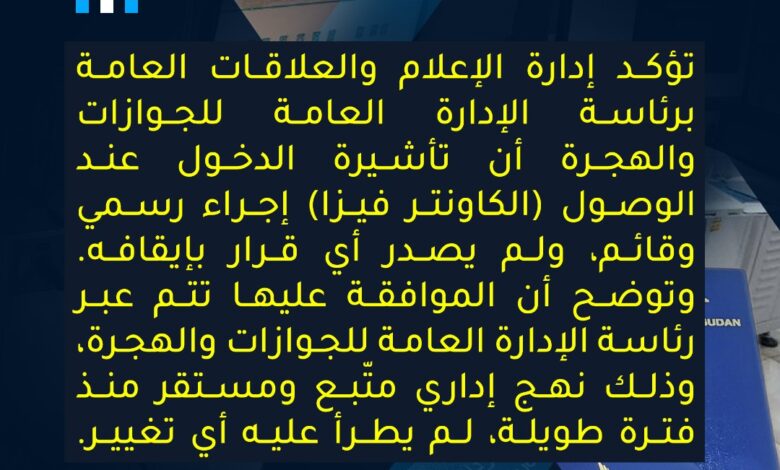 وبحسب الموقع الرسمي للإدارة العامة للجوازات والهجرة، وإدارة الإعلام والعلاقات العامة، فإن تأشيرة الدخول عند الوصول (الكاونتر فيزا) لا تزال إجراءً رسميًا معمولًا به، ولم يصدر أي قرار بإيقافه. كما أوضحت الإدارة أن الموافقة على التأشيرة تتم عبر رئاسة الإدارة العامة للجوازات والهجرة، وفق نهج إداري متّبع ومستقر منذ فترة طويلة، ولم يطرأ عليه أي تغيير.