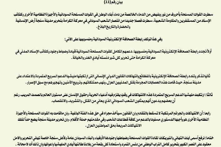 أصدرت رابطة الصحافة الإلكترونية السودانية بيان رقم (11) حول تحرير سنجة من دنس التمرد أكد فيه على دعمها الكامل للقوات المسلحة في معركة الكرامة وارسلت والتهاني للقائد العام وقيادة وضباط وجنود القوات المسلحة والمستنفرين من وكتائب الإسناد بهذا الانتصار الباذخ ، نص البيان :-