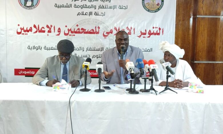 اكد رئيس المقاومة الشعبية بولاية شرق دافور د/ التوم حسب الرسول في ومؤتمر صحفى بمدينة بورتسودان اليوم ببرج الضمان الاجتماعى وقوفھم خلف القوات المسلحة السودانية والقوات المشتركة وكل القوات النظامية حتى يتم القضاء لميشيتا الدعم السريع المتمردة من كل بقاء السودان وقال حسب الرسول ان مؤتمر نيروبى لا يمثل شعب غرب السودان ولا علاقة لھم بھا وان مليشيتا الدعم السريع اجبرت المواطنين العزل على الخروج من ديارھم مما انعكس سالبة على الخدمات الاساسية من تعليم وصحة وزراعة وصناعة تھديد امن المواطن واكد حمدان البشرى الامين العام لتنسيقة الرزيقات حرصھم على وحدة السودان