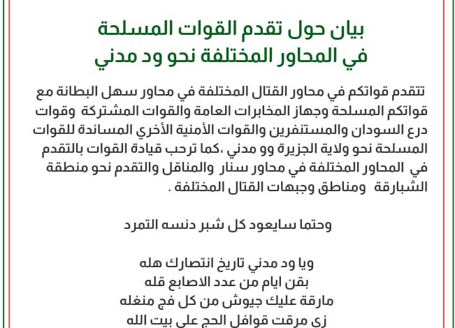 . تقدمت القوات المسلحه تقدم القوات المسلحة وقوات الاورط الشرقيه والقوات المشتركه وجهاز المخابرات العامة وقوات درع الشمال والمستنقرين والقوات الامنيه الاخري المساندةللقوات المسلحة في محاورسهل البطانه ونحو والايه الجزيرة وود مدنى كما ترحب قيادة القوات بالتقدم في المحاور المختلفة في محاور سنار والمناقل والتقدم. نحو منطقه الشبارقه ومناطق وجهات القتال المختلفه