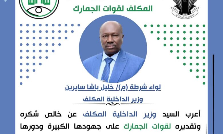 بكل الفخر والإعزاز تهنئ دائرة الإعلام والعلاقات العامة السيد مدير عام قوات الجمارك المكلف والسادة مساعدي المدير العام وكل مدراء الإدارات العامة ومنسوبي القوات بإشادة السيد وزير الداخليه المكلف، كما تتقدم بأحر التبريكات والتهاني للسيد اللواء صلاح أحمد ابراهيم مدير القوات المكلف والسيد اللواء ياسر صديق محمد أحمد مساعد المدير العام والسيد العميد (حقوقي) جمال العوض محمد الأمين مدير الإدارة العامة للشؤون القانونية والمخالفات والسيد العميد بابكر محمد قسم الله أمين عام مال الخدمات وذلك لنيلهم إشادات من السيد وزير الداخلية المكلف لما قاموا به من عمل ساهم في دعم المجهود الحربي وتوفير كميات مقدرة من الأدوية والإحتياجات الأخرى.